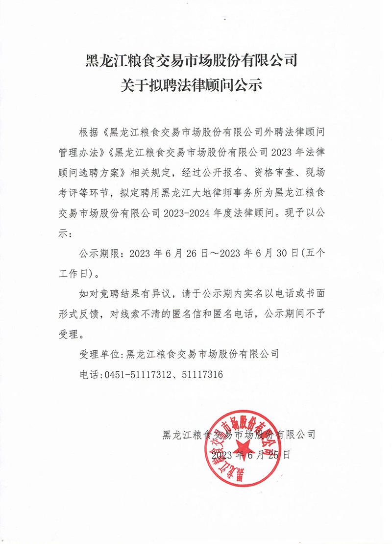 黑龍江糧食交易市場(chǎng)股份有限公司關(guān)于擬聘法律顧問(wèn)公示