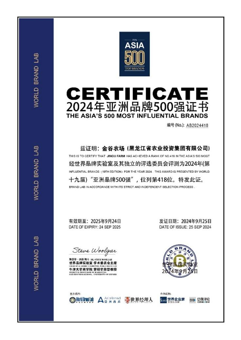 9月25日,由世界品牌實(shí)驗(yàn)室(World Brand Lab)主辦的2024年“亞洲品牌大會(huì)”在香港舉行,會(huì)上發(fā)布了2024年《亞洲品牌500強(qiáng)》排行榜。黑龍江省農(nóng)業(yè)投資集團(tuán)有限公司(以下簡稱“農(nóng)投集團(tuán)”)“金谷農(nóng)場”品牌再次榮登《亞洲品牌500強(qiáng)》排行榜第418位,較2023年的436位,提升了18位,再一次提升了“金谷農(nóng)場”的品牌影響力和企業(yè)的核心競爭力,這一卓越成就為黑龍江省的農(nóng)業(yè)品牌發(fā)展也增添了濃墨重彩的一筆。