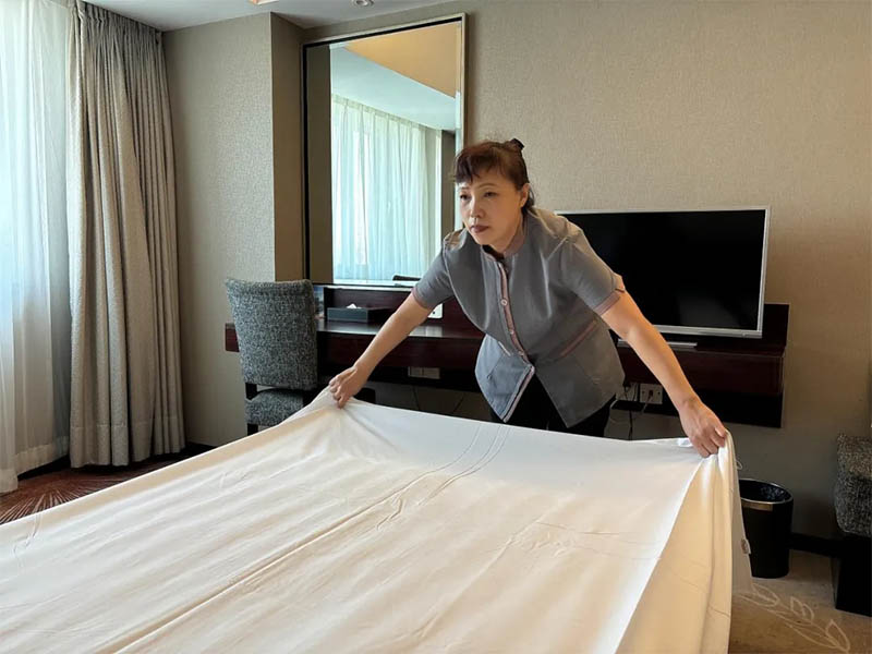 還有這樣一群可愛的人,他們是金谷商務(wù)清掃員,堅守崗位、默默奉獻(xiàn)是他們的座右銘,用他們的“舍”和“離”換來客人出游的便利,工作加班加點,不辭辛勞地打掃房間、更換床單被罩、補(bǔ)充日用品,為客人提供整潔舒適的住宿環(huán)境。