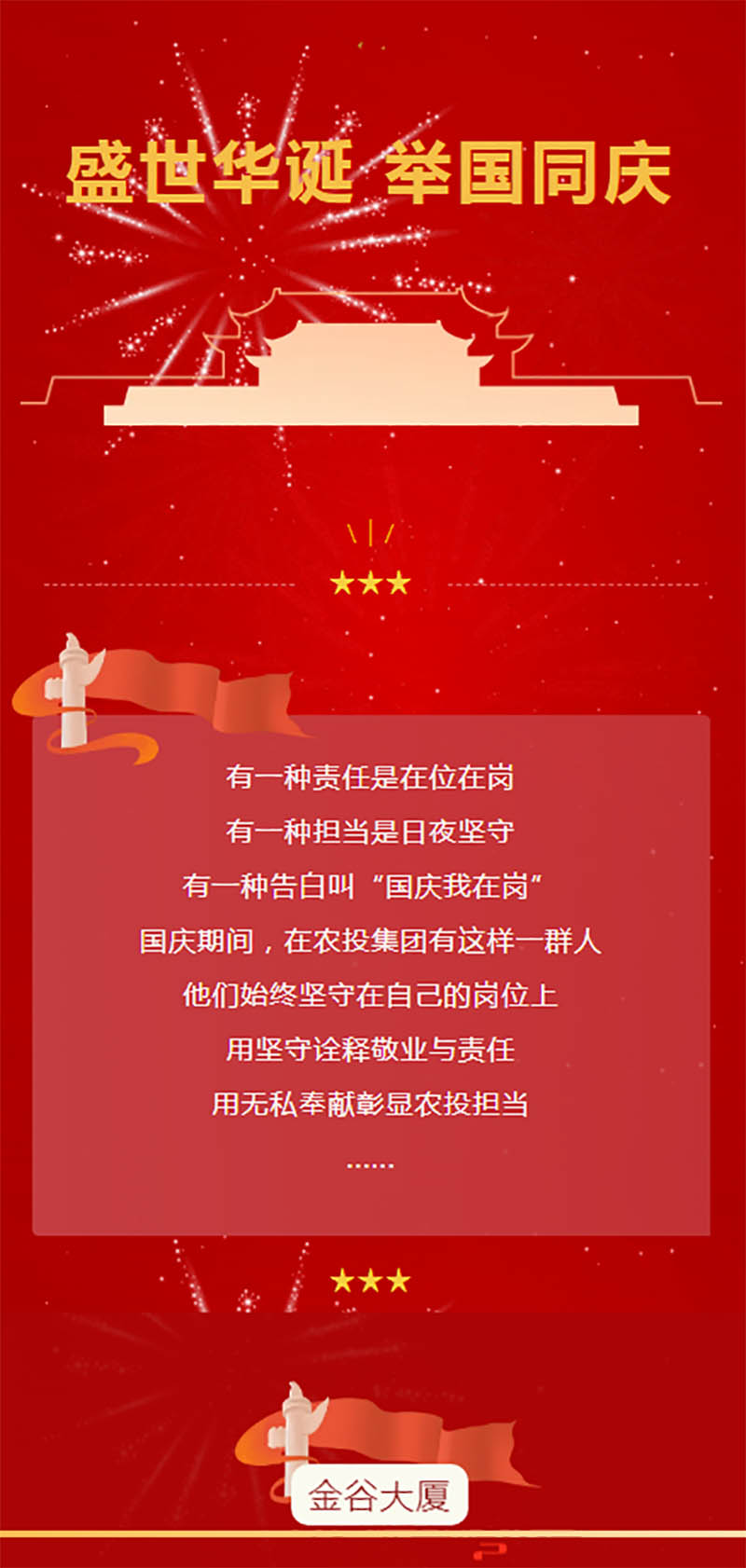 “功崇惟志,業(yè)廣惟勤?!鞭r(nóng)投金谷人在平凡的崗位上兢兢業(yè)業(yè),以昂揚(yáng)的姿態(tài)慶祝中華人民共和國成立75周年,用奮斗書寫著高質(zhì)量發(fā)展的新篇章。