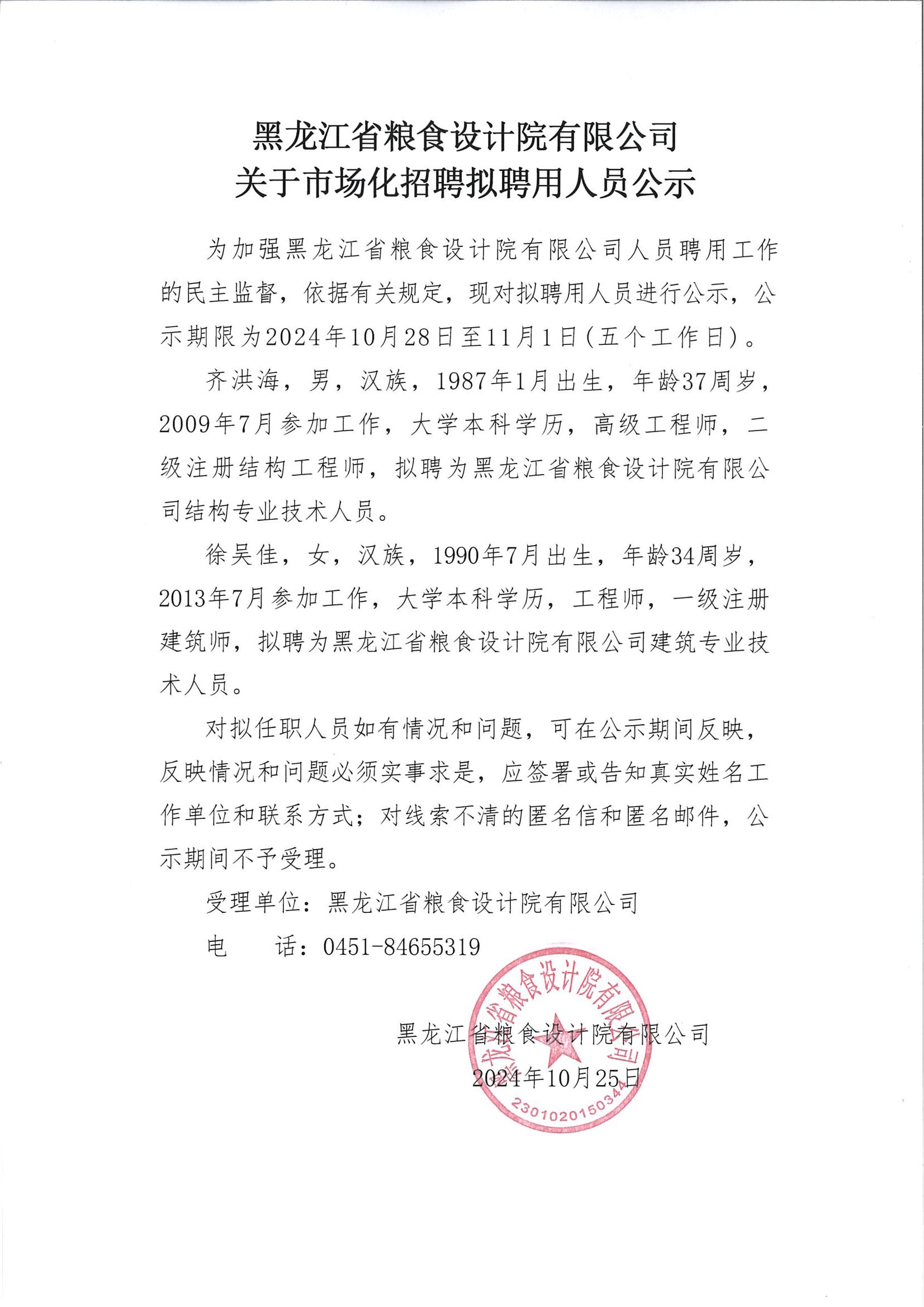 黑龍江省糧食設(shè)計(jì)院有限公司關(guān)于市場(chǎng)化招聘擬聘用人員公示