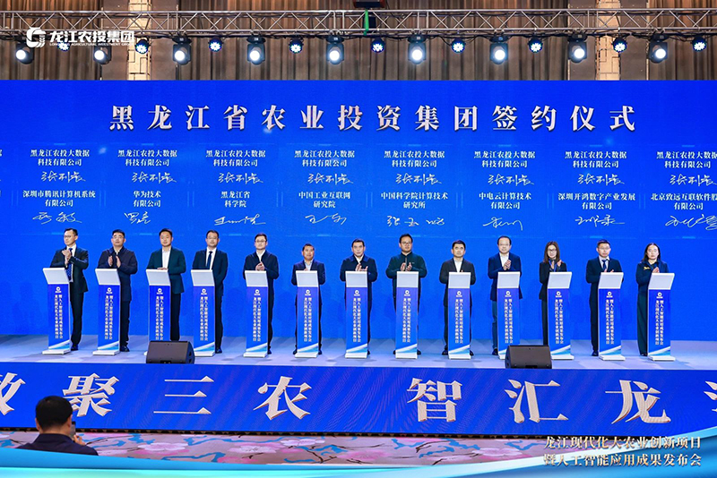 會上,農(nóng)投大數(shù)據(jù)公司與中國科學(xué)院計算技術(shù)研究所、工聯(lián)院網(wǎng)絡(luò)所、中國電子云、黑龍江省科學(xué)院、深開鴻、華為技術(shù)有限公司、致遠互聯(lián)、騰訊云、商湯科技、黑龍江移動、哈爾濱聯(lián)飛、鄭州華糧等12家單位簽署了戰(zhàn)略合作協(xié)議,標(biāo)志著各方將在智慧農(nóng)業(yè)領(lǐng)域展開深度合作,共同推動黑龍江省農(nóng)業(yè)數(shù)智化進程。發(fā)布會現(xiàn)場還展示了“伏羲農(nóng)場”無人智慧農(nóng)機裝備和無人機試飛、水肥一體化等設(shè)備,展現(xiàn)了智慧農(nóng)業(yè)的先進技術(shù)和應(yīng)用成果。