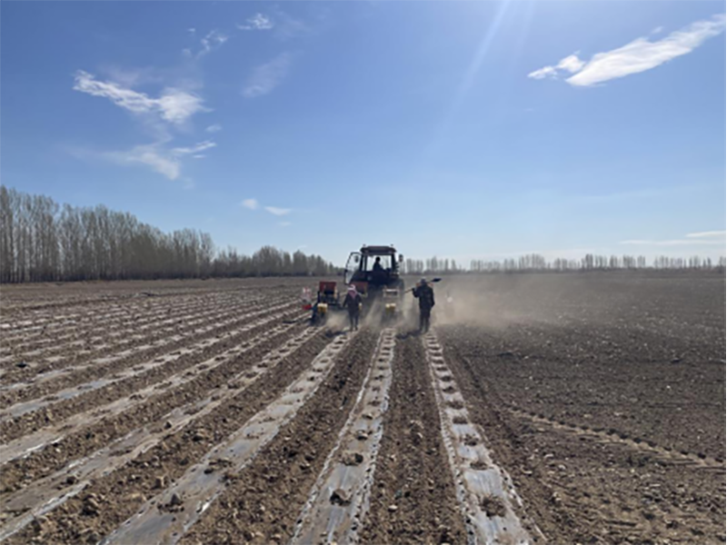 △鮮食玉米陸續(xù)播種工作中,生產(chǎn)部員工隨機(jī)械實時檢查播種情況。