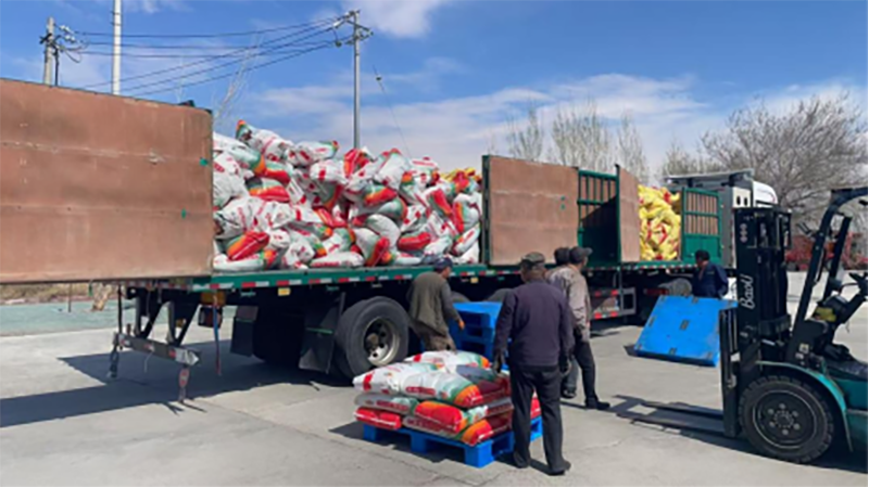 △種植用的肥料陸續(xù)到廠,龍疆金谷員工協(xié)助貨車司機(jī)卸肥料。