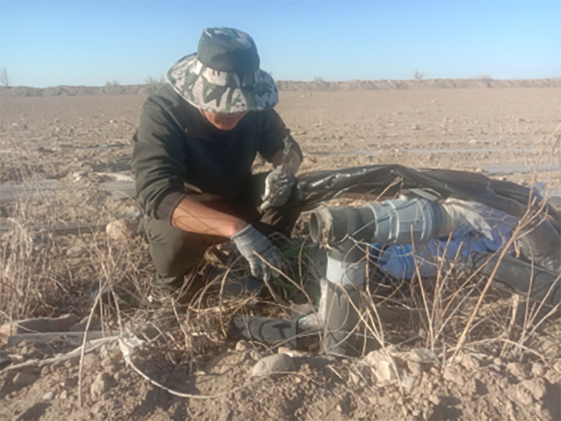 △龍疆金谷生產(chǎn)部工作人員在玉米地里檢修出水樁,確保出苗關(guān)鍵期及時澆水。
