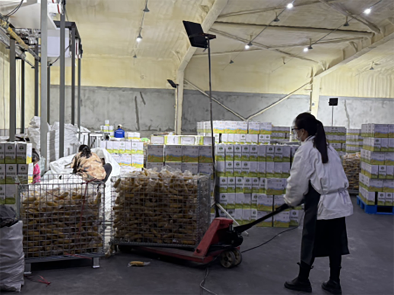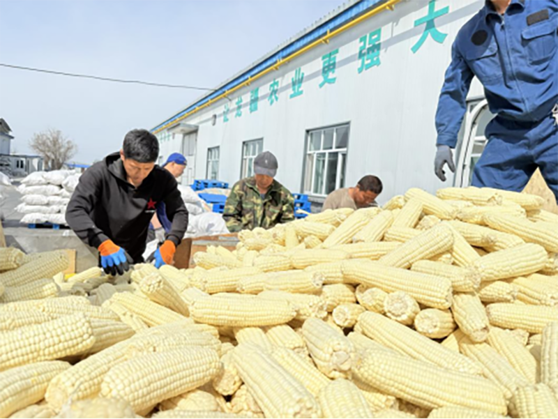 △庫房外正對速凍玉米進(jìn)行分揀工作,保證五一訂單出貨。