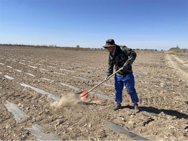 △生產(chǎn)部員工正對剛播種覆膜的玉米種子進(jìn)行壓地膜工作。