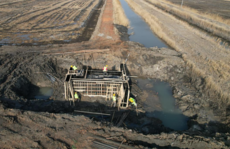 △肇源縣鹽堿地綜合利用試點項目第一標(biāo)段項目,施工人員正在退水閘模板支護施工。