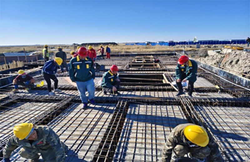 △肇源縣鹽堿地綜合利用試點項目第一標(biāo)段項目,施工人員正在二號墻排站,進行鋼筋綁扎施工,管理人員檢查施工質(zhì)量。
