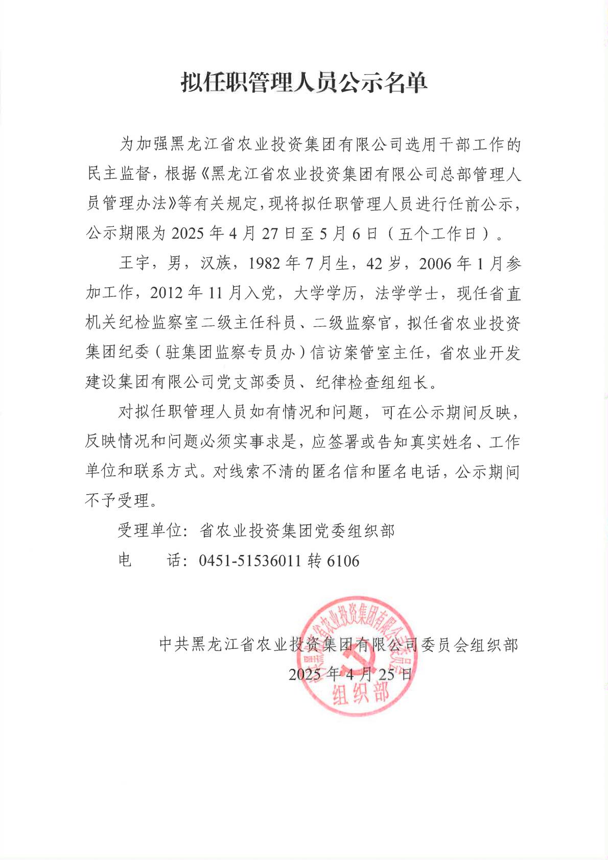 黑龍江省農(nóng)業(yè)投資集團(tuán)有限公司關(guān)于市場(chǎng)化選聘擬聘用人員公示