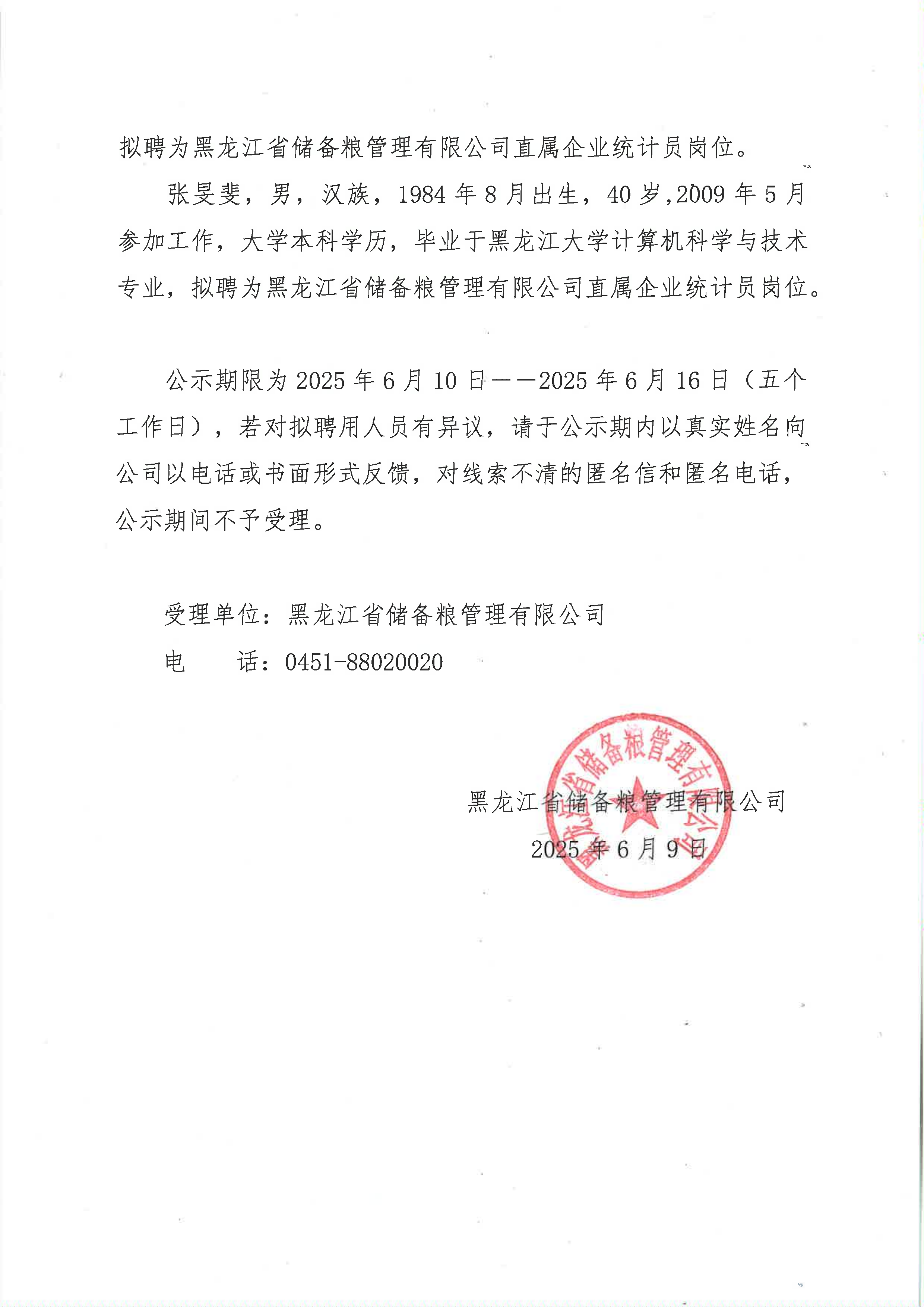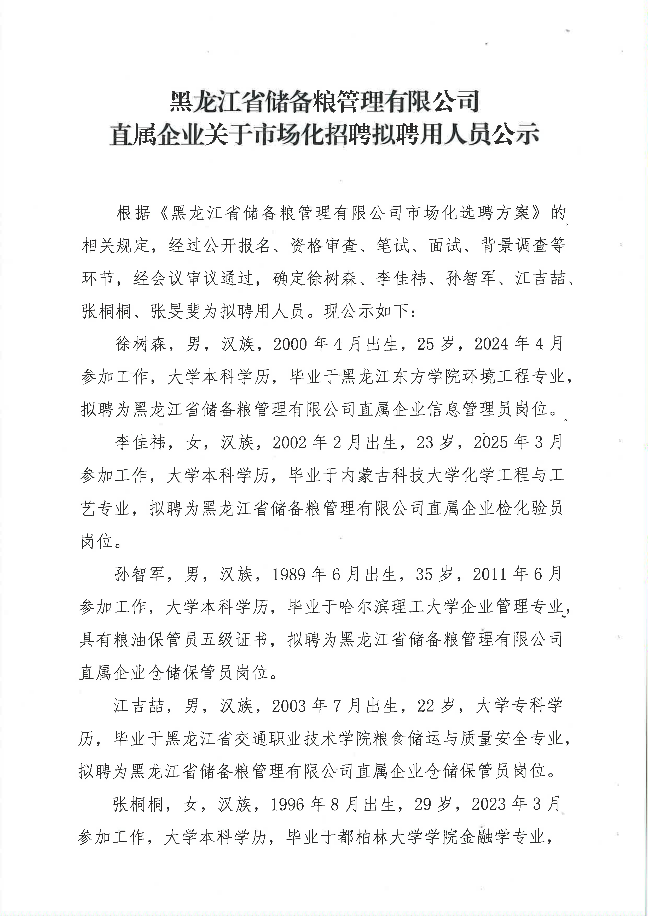 黑龍江省儲(chǔ)備糧管理有限公司直屬企業(yè)關(guān)于市場(chǎng)化招聘擬聘用人員公示